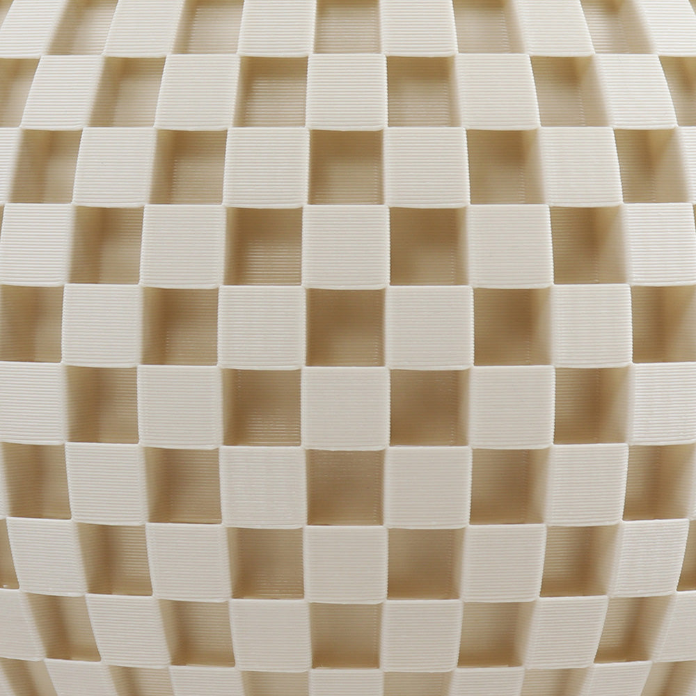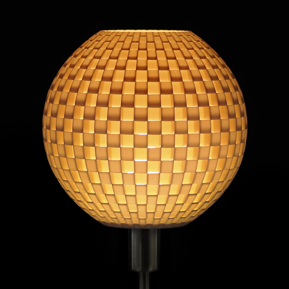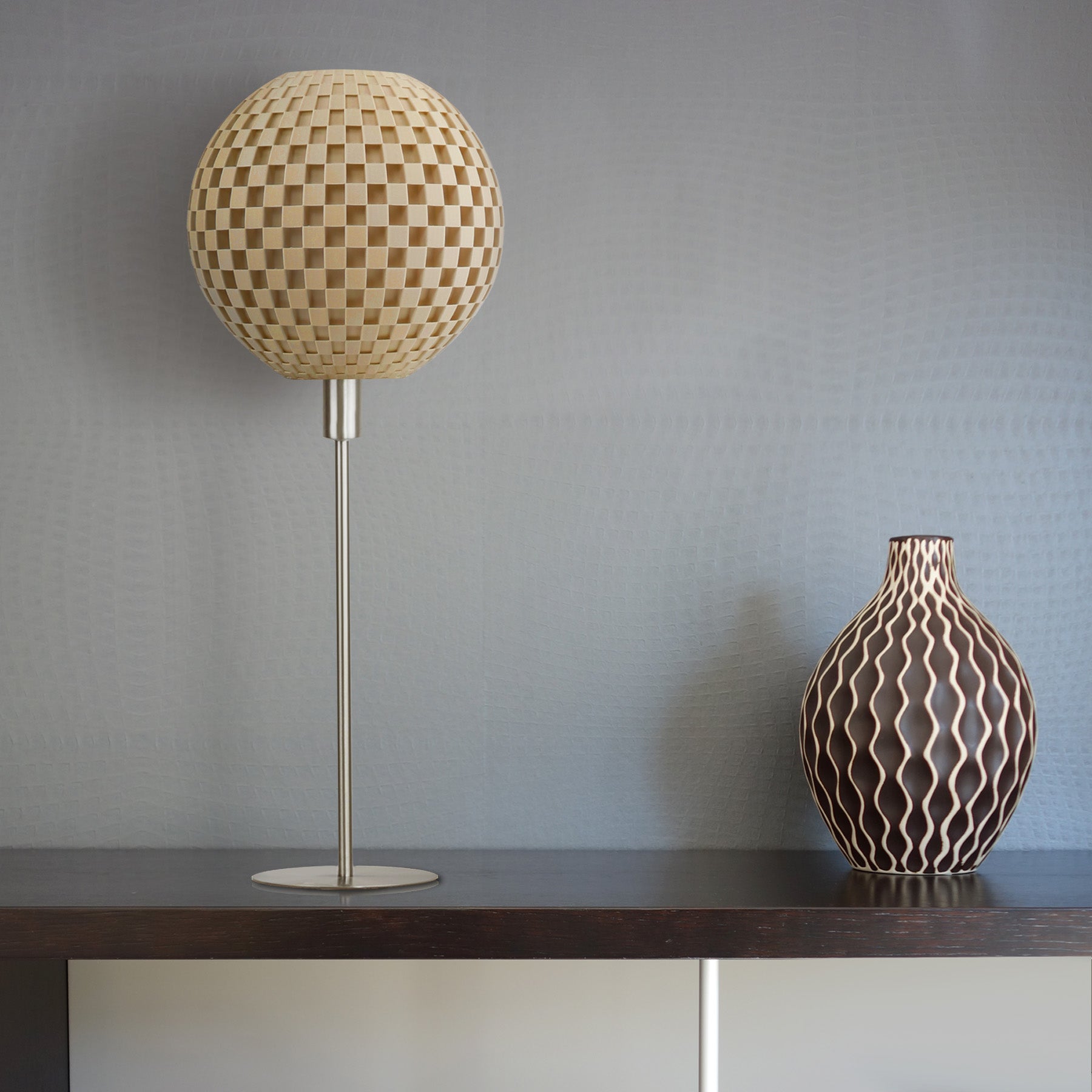 Mit modernen 3D-Druckern wird der Lampenschirm der Designleuchte unter Verwendung eines recycelbaren Rohstoffes frei von Erdöl und toxischen Bestandteilen hergestellt. Das innovative Design von smart lamps erinnert dabei an ein Geflecht oder Schachbrettmuster und erschafft eindrucksvolle Licht- und Schattenspiele beim Einschalten des Lichts.