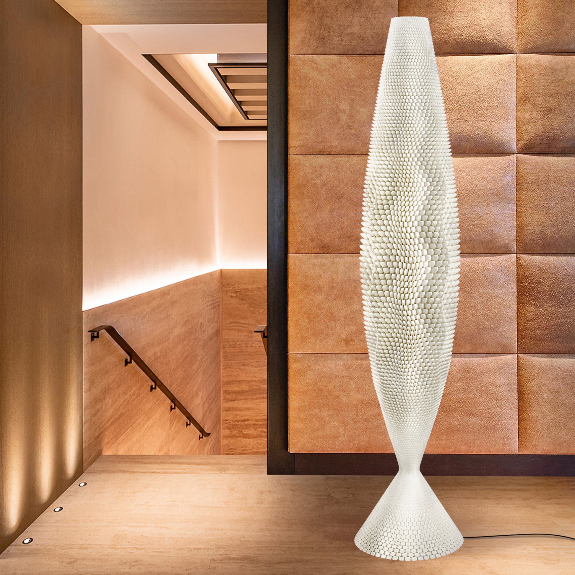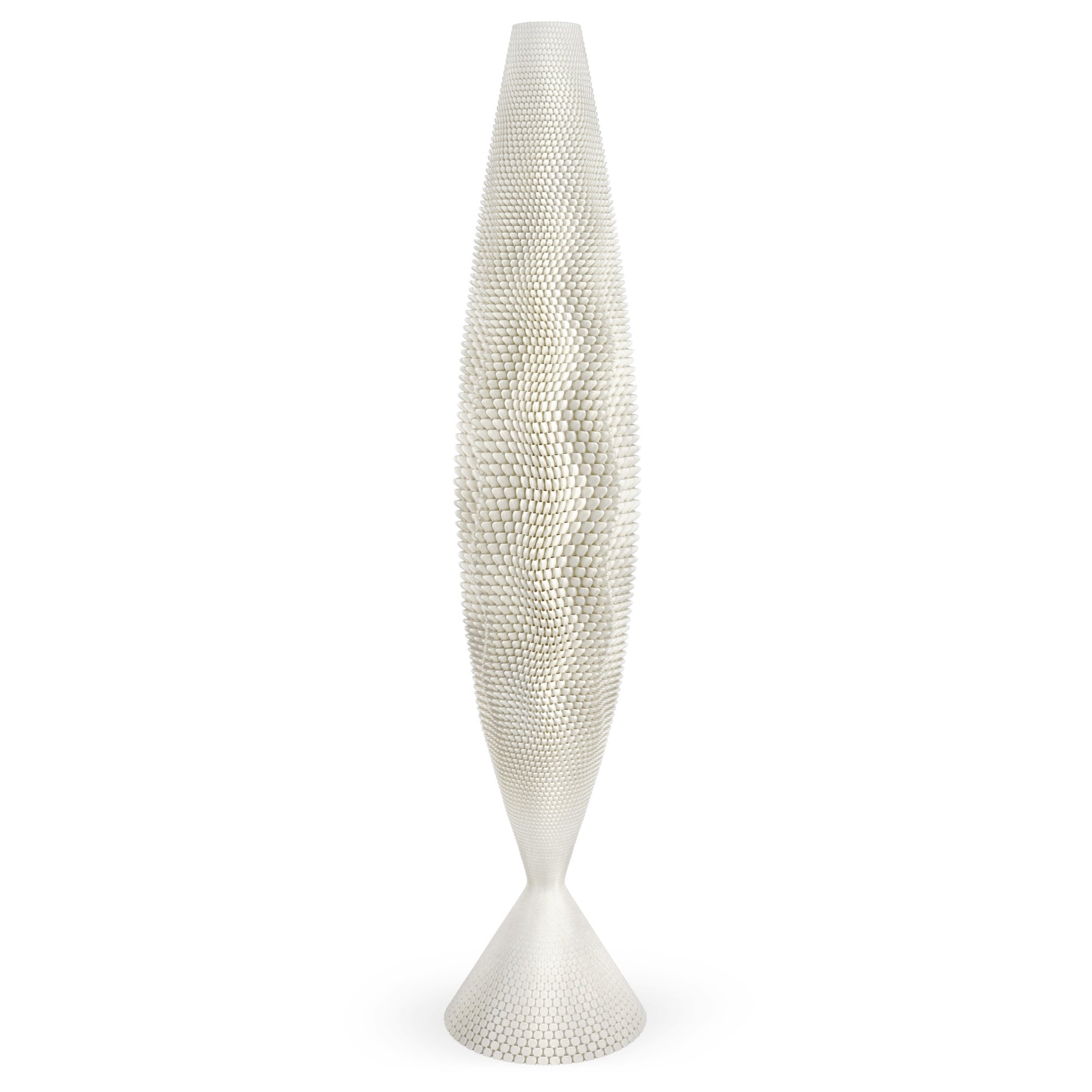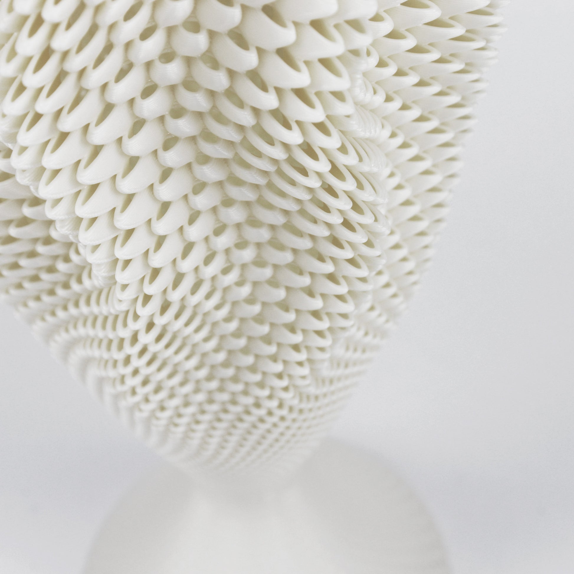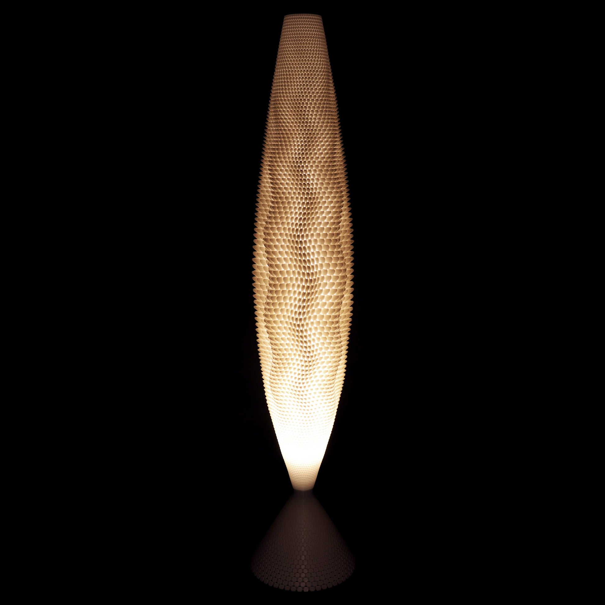 Mit modernen 3D-Druckern wird diese Superskulptur unter Verwendung eines biobasierten Rohstoffes frei von Erdöl und toxischen Bestandteilen hergestellt. Das innovative Design von smart lamps beinhaltet eine besondere biomorphe 3D-Struktur und erschafft eindrucksvolle Licht- und Schattenspiele beim Einschalten des Lichts.